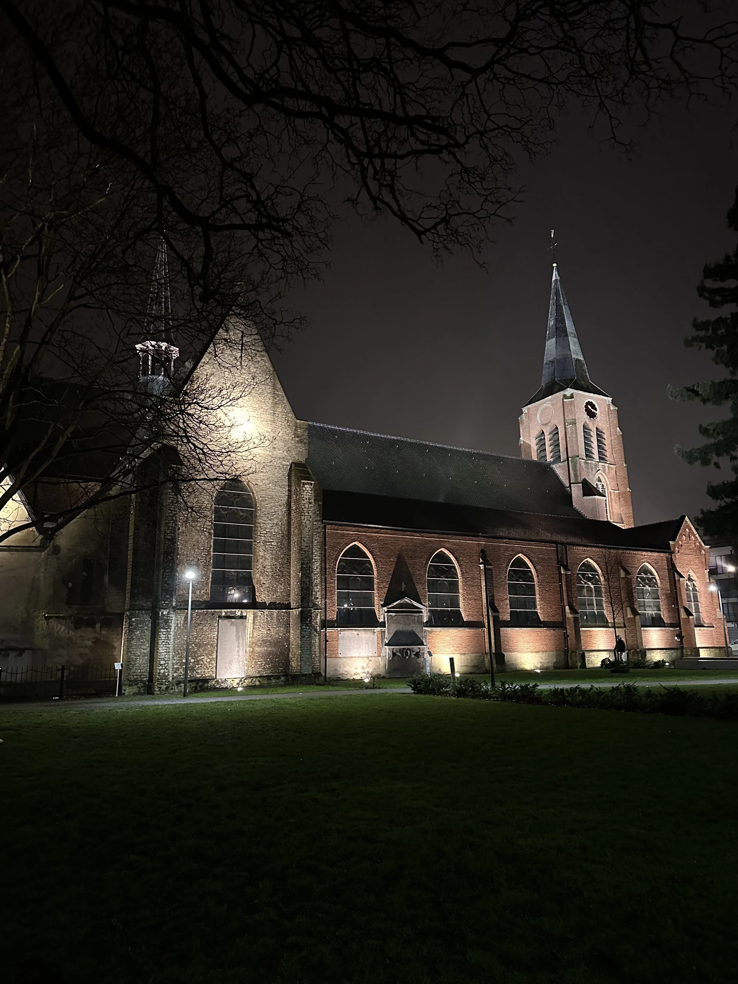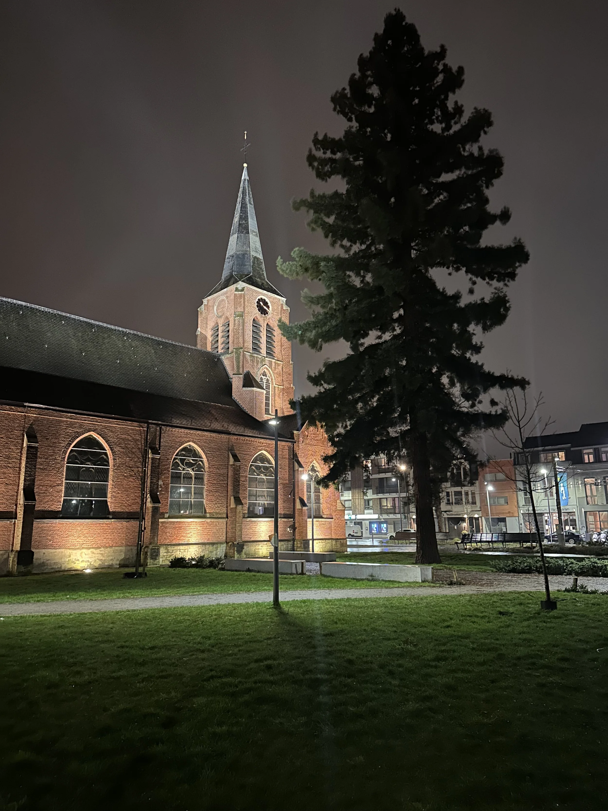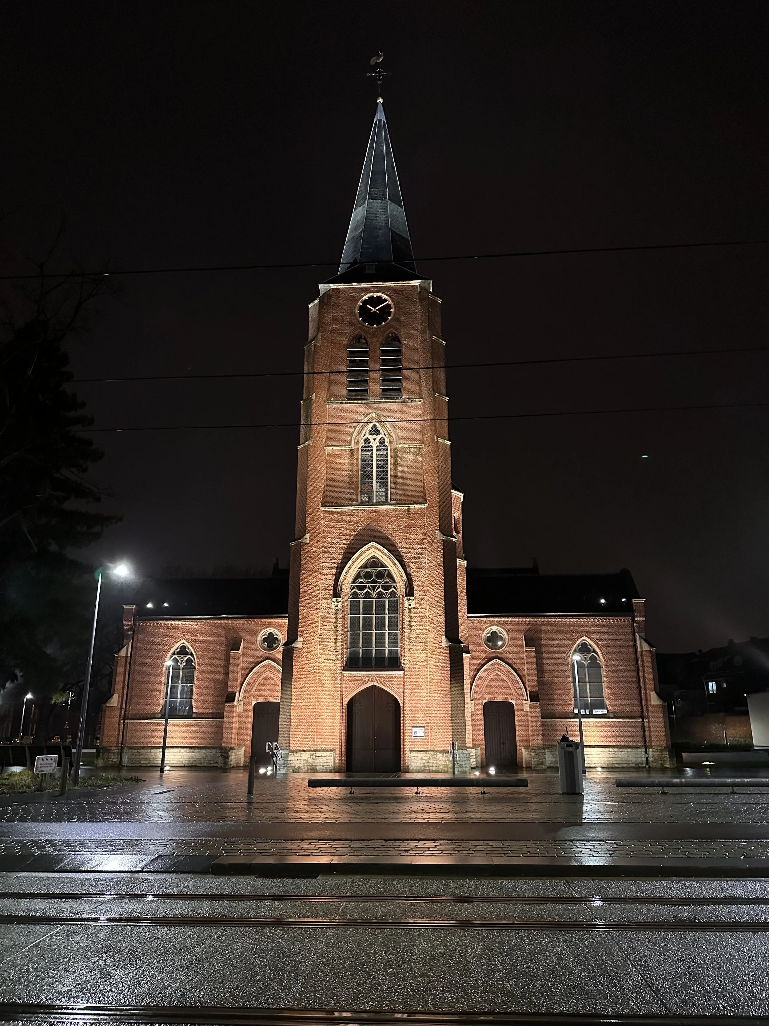 La mise en lumière de l’église adopte une approche sobre et respectueuse de son architecture. Une lumière chaude révèle les façades en pierre, tandis qu’une lumière plus neutre souligne la toiture, créant une lecture harmonieuse des matériaux et des volumes. La verticalité de la tour et les éléments gothiques sont mis en valeur avec précision, sans excès de contraste ni de consommation énergétique.